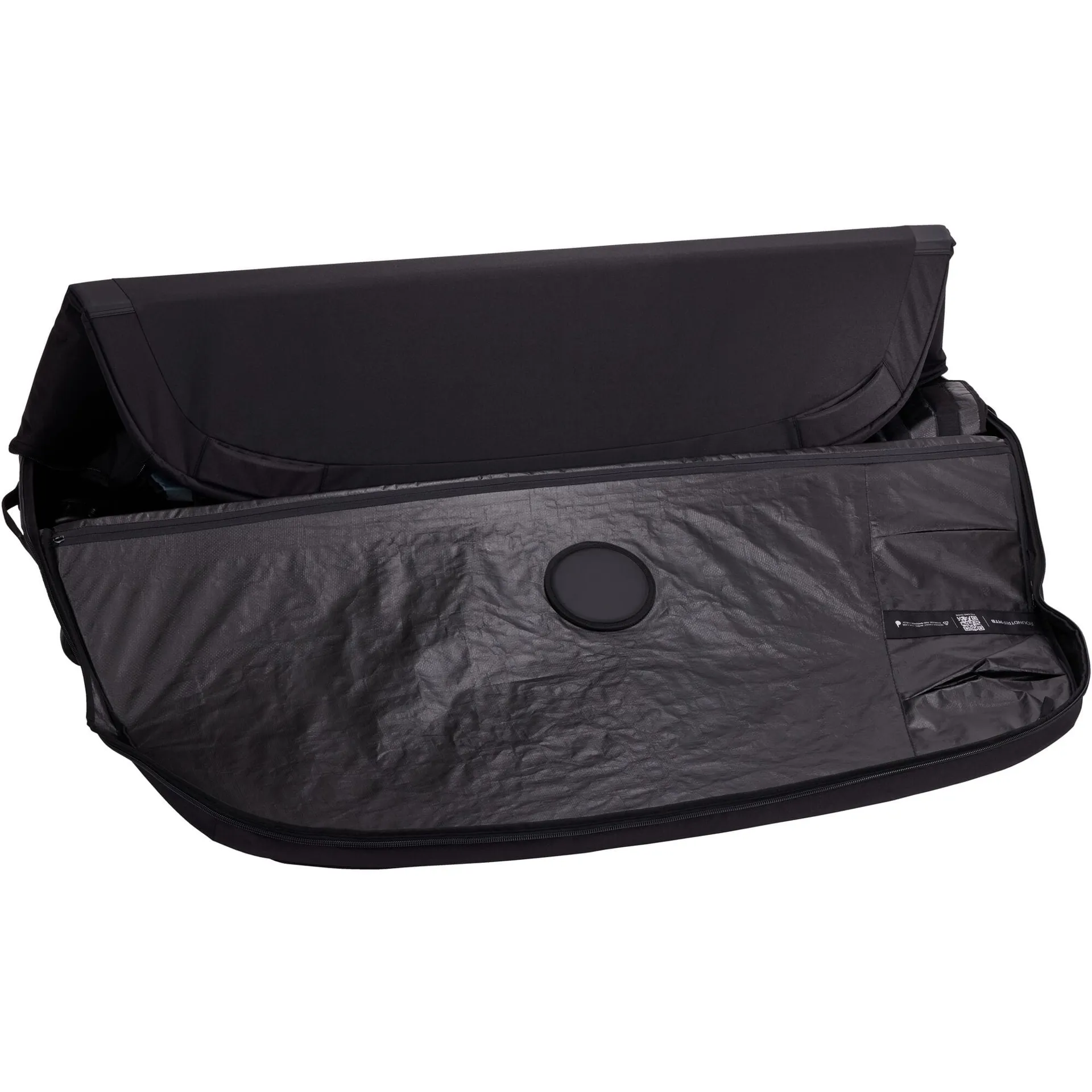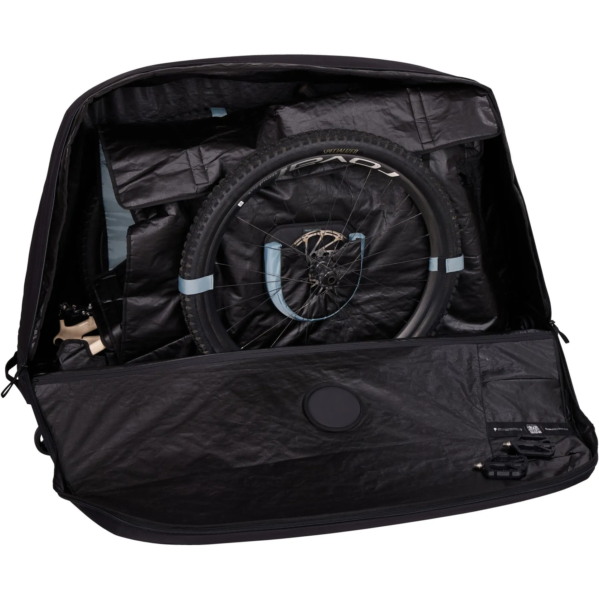 Everything inside stays put. Padded panels and secure mounting points lock parts in place, even after security inspections. Rigid side panels and a molded HDPE bottom tub resist impact. Brake rotor pockets keep rotors aligned and free from bending stress. Tailored packing pieces cradle handlebars, seat, seat post and drivetrain so nothing rattles into trouble.