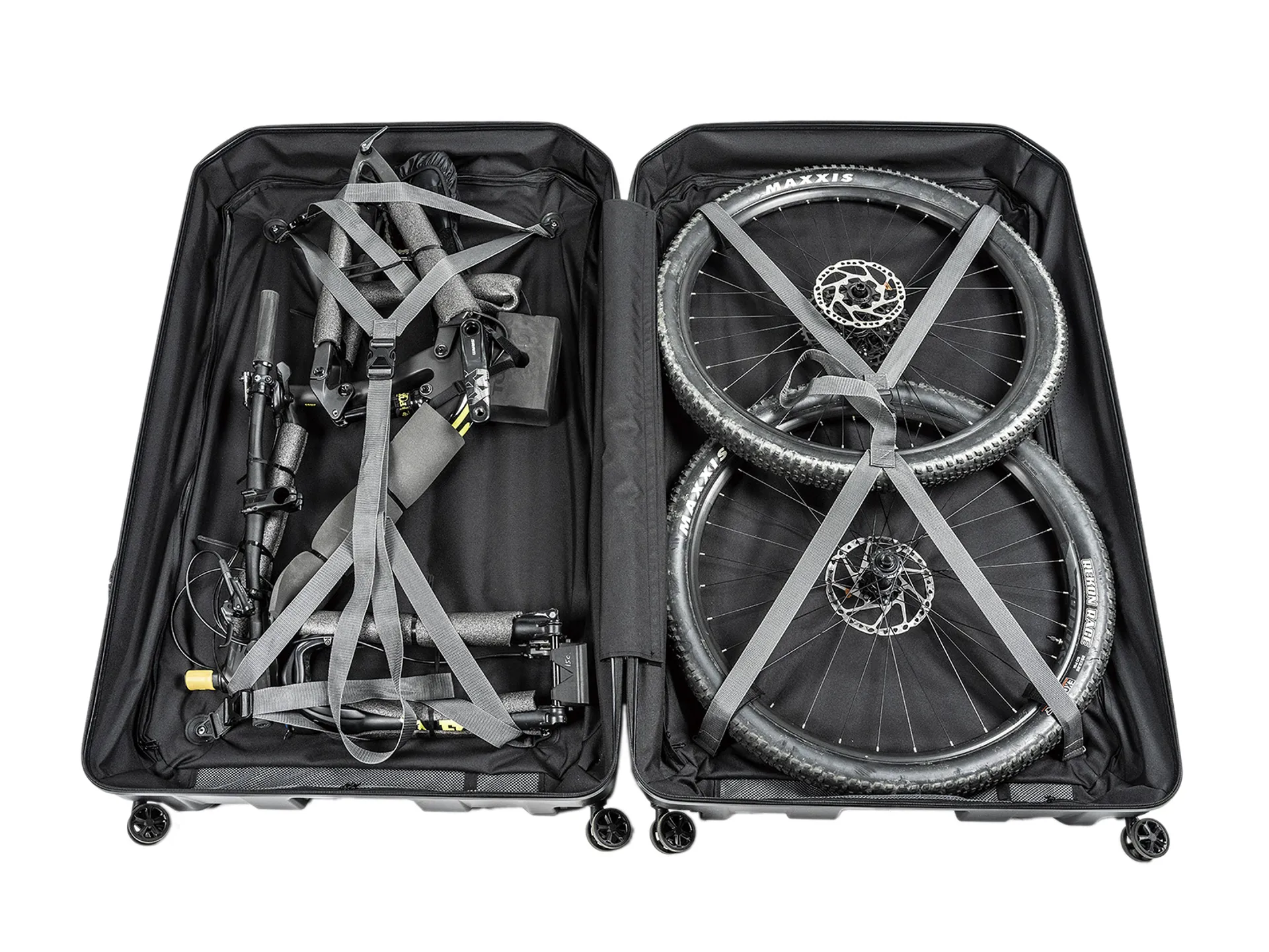 Protective sleeves and a drivetrain cover keep metal off carbon and grease off kits. Inner pockets hold small parts, tools and paperwork so you won’t be rifling through the case when you land. Everything stays tidy all the way to the trail.