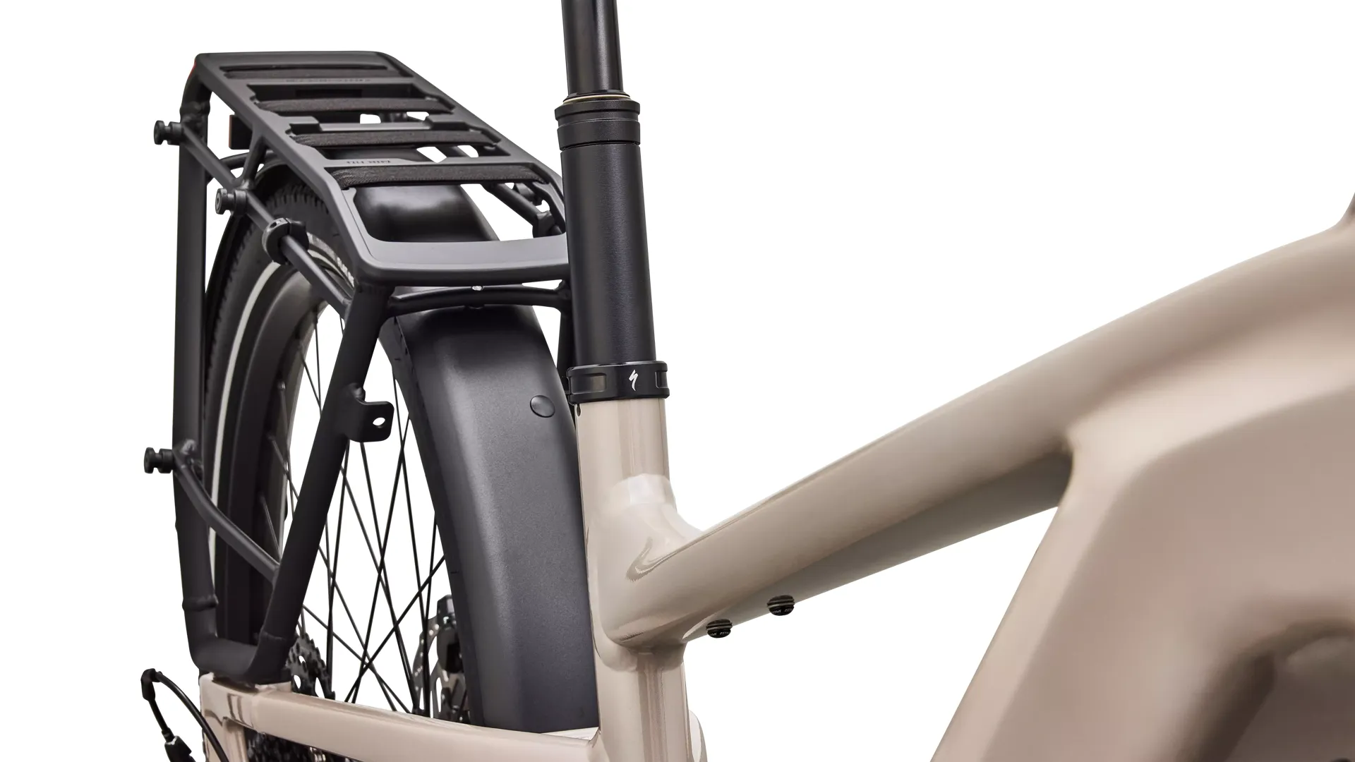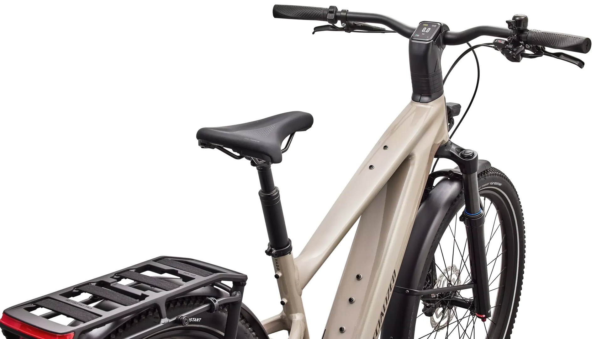 • Practical extras and comfort kit: Alloy stem with integrated display and USB‑C charger, Body Geometry Rivo 2 Gel saddle, Turbo anti‑slip pedals, adjustable MASSLOAD kickstand, full fenders and a MIK HD rear rack with integrated elastics.