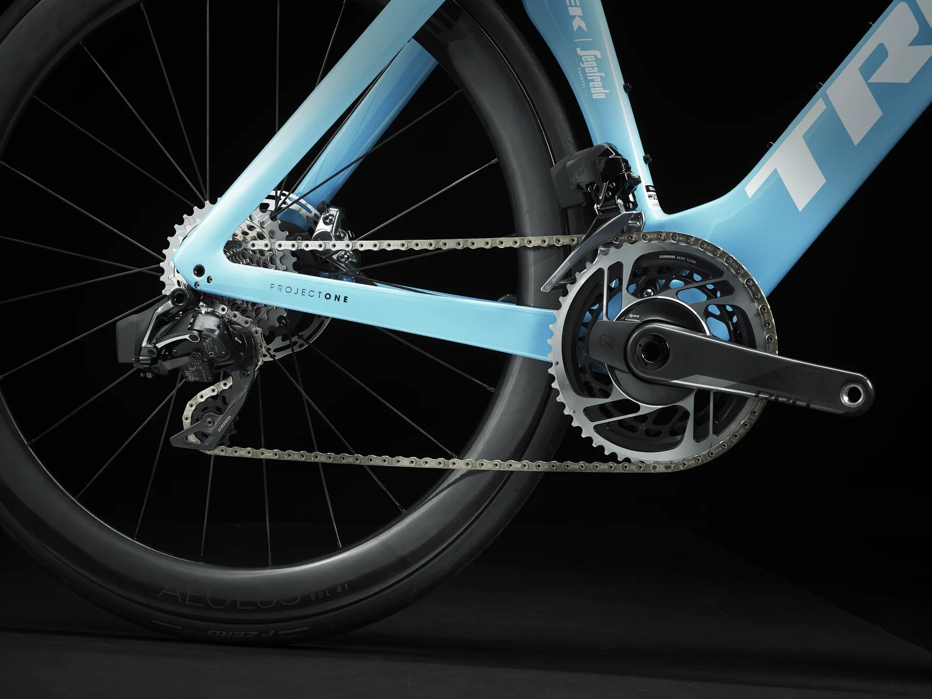 A lightweight frame with our highest-level 800 Series OCLV Carbon, an all-new generation of Kammtail aerodynamic tube shaping, aerodynamic and road-smoothing IsoFlow technology and invisible cable routing. A wireless electronic SRAM RED AXS drivetrain and flat-mount hydraulic disc brakes, power meter cranks for performance metrics, tubeless-ready Bontrager Aeolus RSL 51 carbon wheels and an integrated OCLV Carbon bar/stem combo.