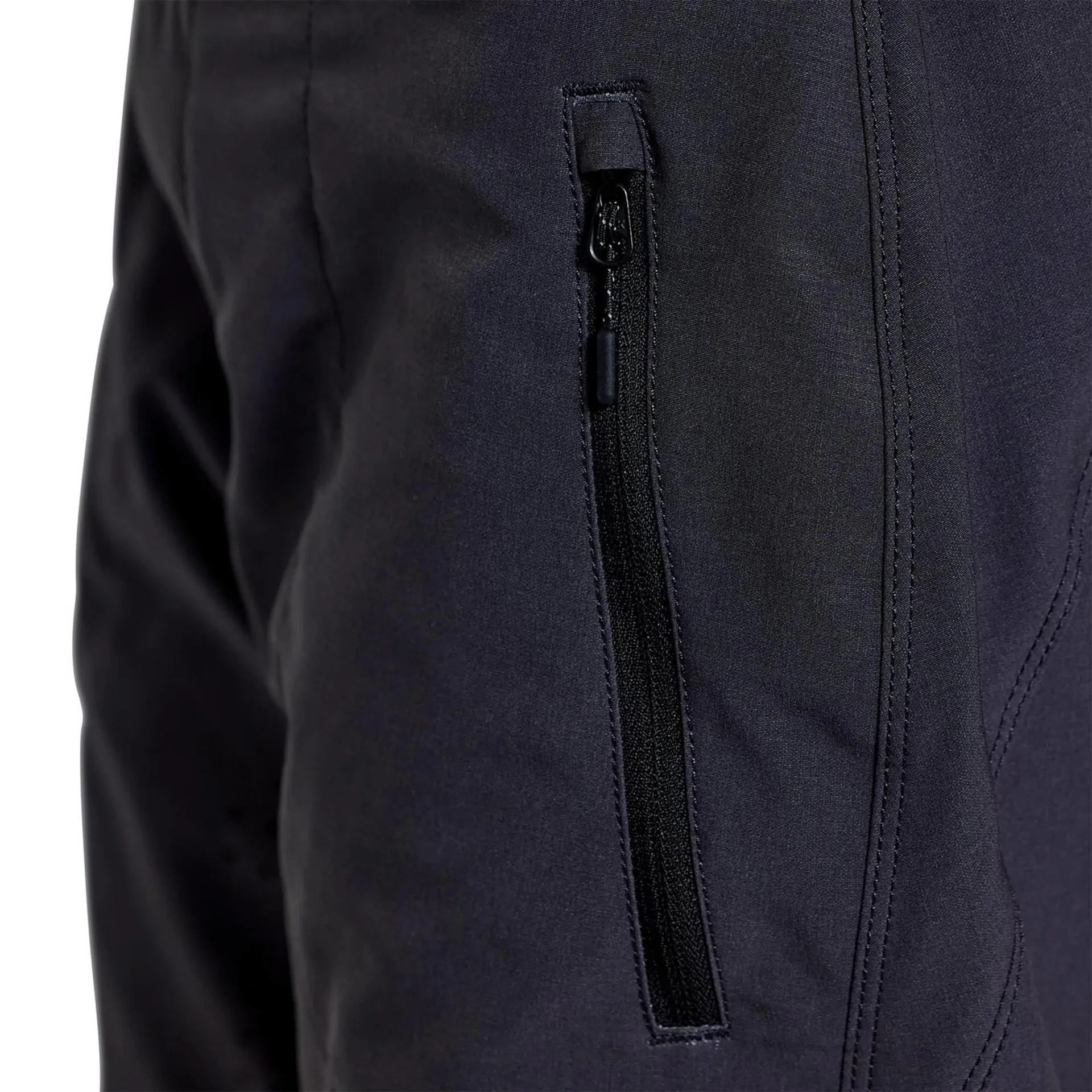 Three discrete zip pockets hold phone and essentials. Zippers are YKK for smooth, reliable closure. A 20" outseam hangs at the sweet spot for coverage without catching on the bike.