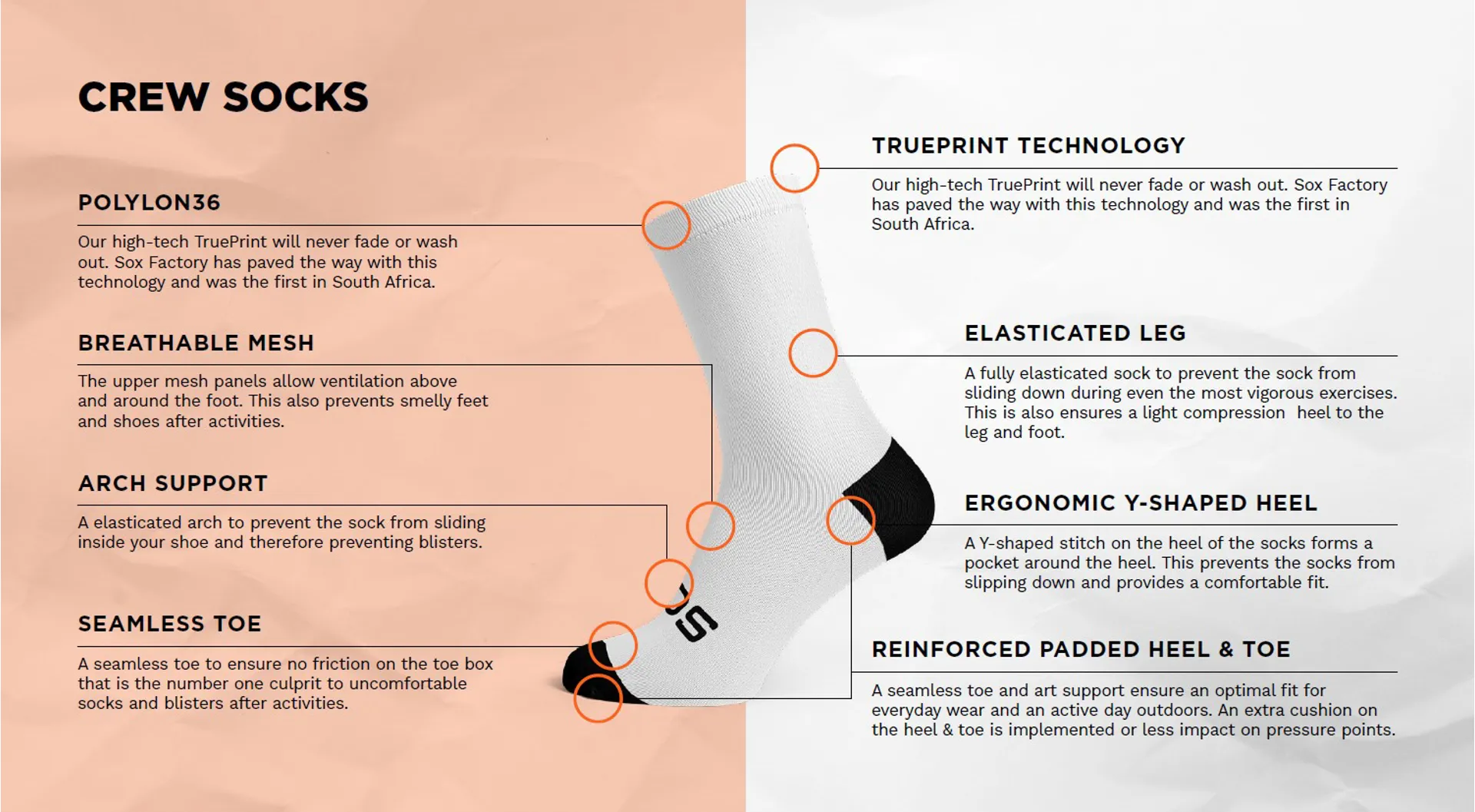 • Fit features: seamless toe, Y-shaped heel, slight compression
